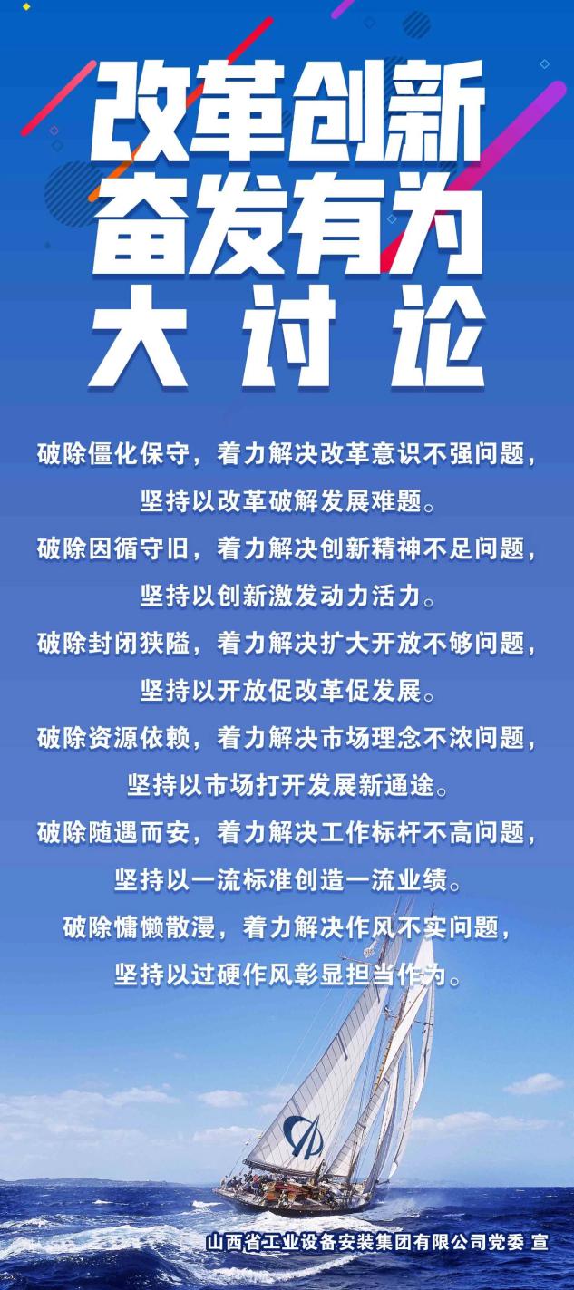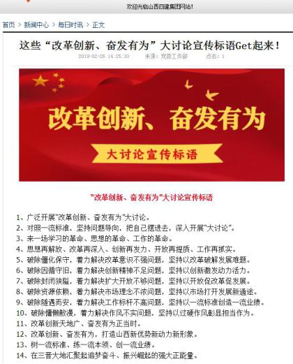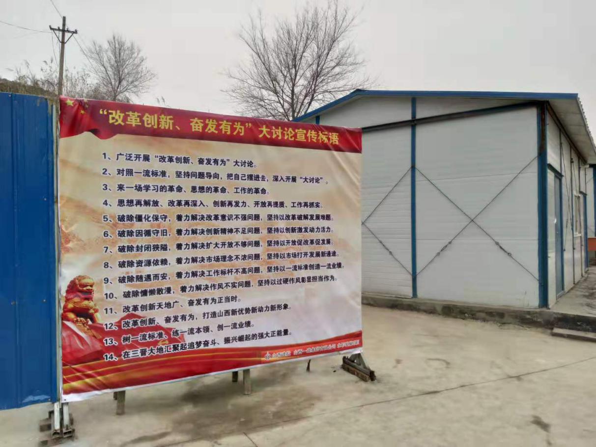 山西建投党委迅速下发《关于张挂刊播“刷新立异、高昂有为”大讨论宣传口号的通知》,要求集团所属各单位各项目部连忙开展大讨论宣传口号张挂刊播运动。