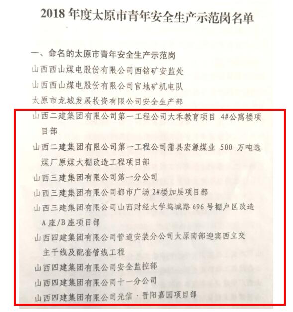 克日,共青团太原市委、太原市安监局团结下发《关于命名和认定2018年度太原市青年清静生产树模岗的决议》,山西建投31个整体喜获“2018年度太原市青年清静生产树模岗”。
