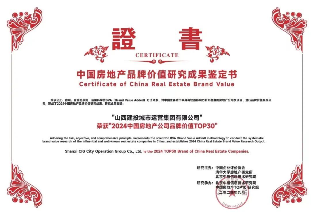▲2024中国房地产公司品牌价值top30证书