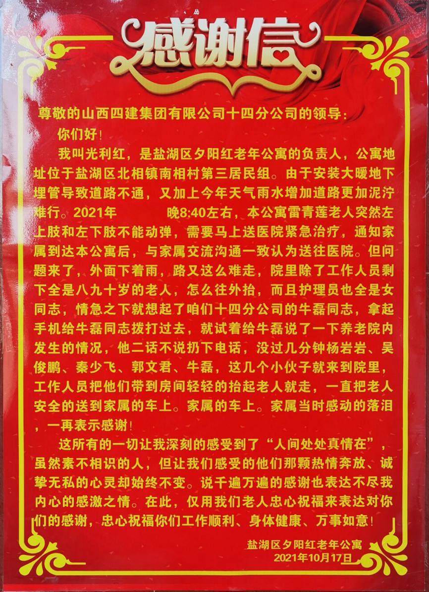 集中供热事关黎民,是重大的民生工程。项目治理职员经常深入住户家中实地走访,并举行现场丈量,对差别住民提出的差别问题,耐心向住户诠释说明,并认真做好相关纪录,施工中实时协调解决,与周边住民建设了温馨融洽的关系。一天,项目部治理职员在夜间例行检查时,接到集中供热所在区域斜阳红晚年公寓认真人光利红的求助电话,有一位老人突发疾病,需要马上送医院紧迫治疗,因下雨时代蹊径泥泞,车辆无法通行。项目职员牛磊、杨岩岩、吴俊鹏、秦少飞及工人郭文君没有丝毫犹豫,急遽前往晚年公寓,协助事情职员将老人抬出,并清静送上车,使得老人实时获得医治。