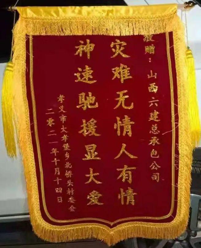 10月9日23时 ,六建集团总承包公司得知孝义市大孝堡镇北桥头村受灾严重 ,迅速组织防汛救灾爱心捐赠行动 ,不到半天时间 ,第二天中午就为村里捐赠了发电机1台、污水泵6台、水带225米、雨衣20件、雨鞋20双 ,并送到了村里。家住孝义市大孝堡镇北桥头村的员工梁月新自制爱心条幅 ,在捐赠物资的同时 ,资助老乡提振信心 ,点燃希望!