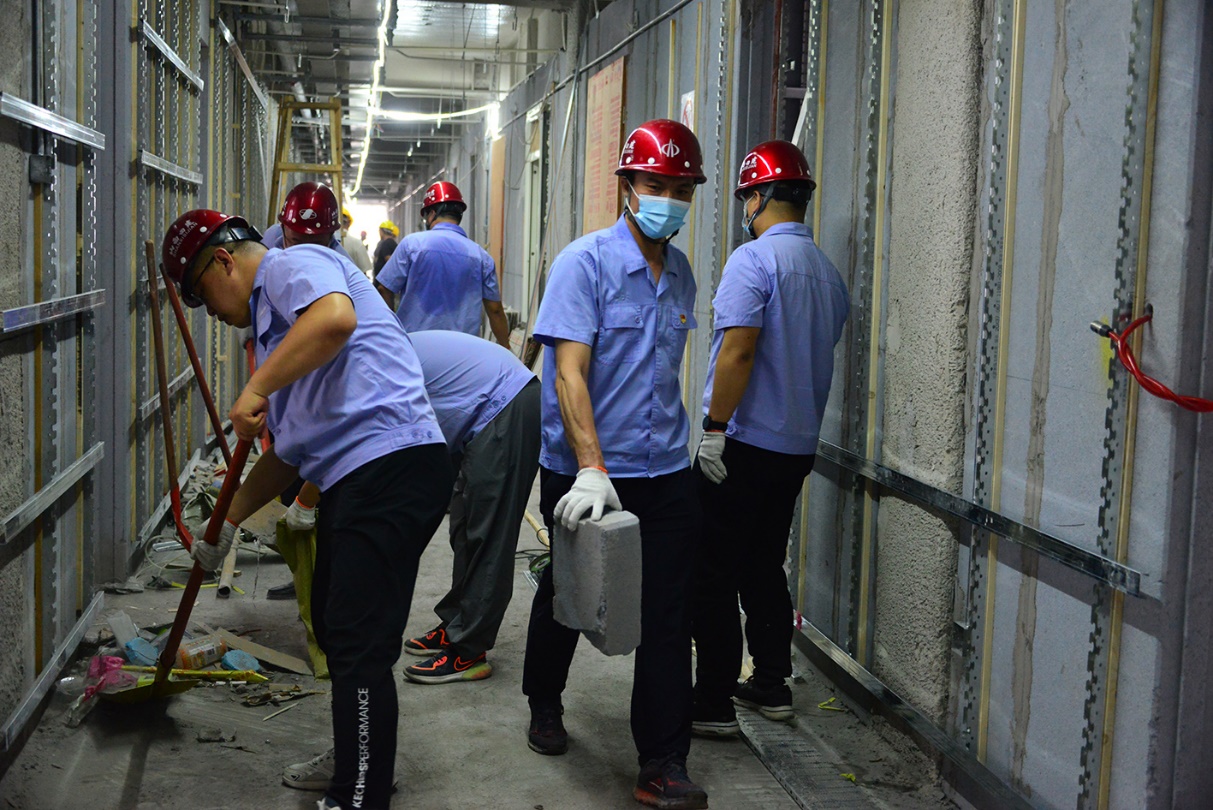 本次义务劳动主要是整理楼层内的修建垃圾、扫除现场卫生等。在劳动现场,各人头戴清静帽,手拿铁锹、扫把等工具,甩开臂膀,投入到主要的劳动当中。盛夏时节,气温较高,汗水很快浸透了衣服,汗水与灰尘凝聚在一起,各人亲自体会到了项目一线员工的艰辛。