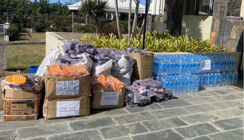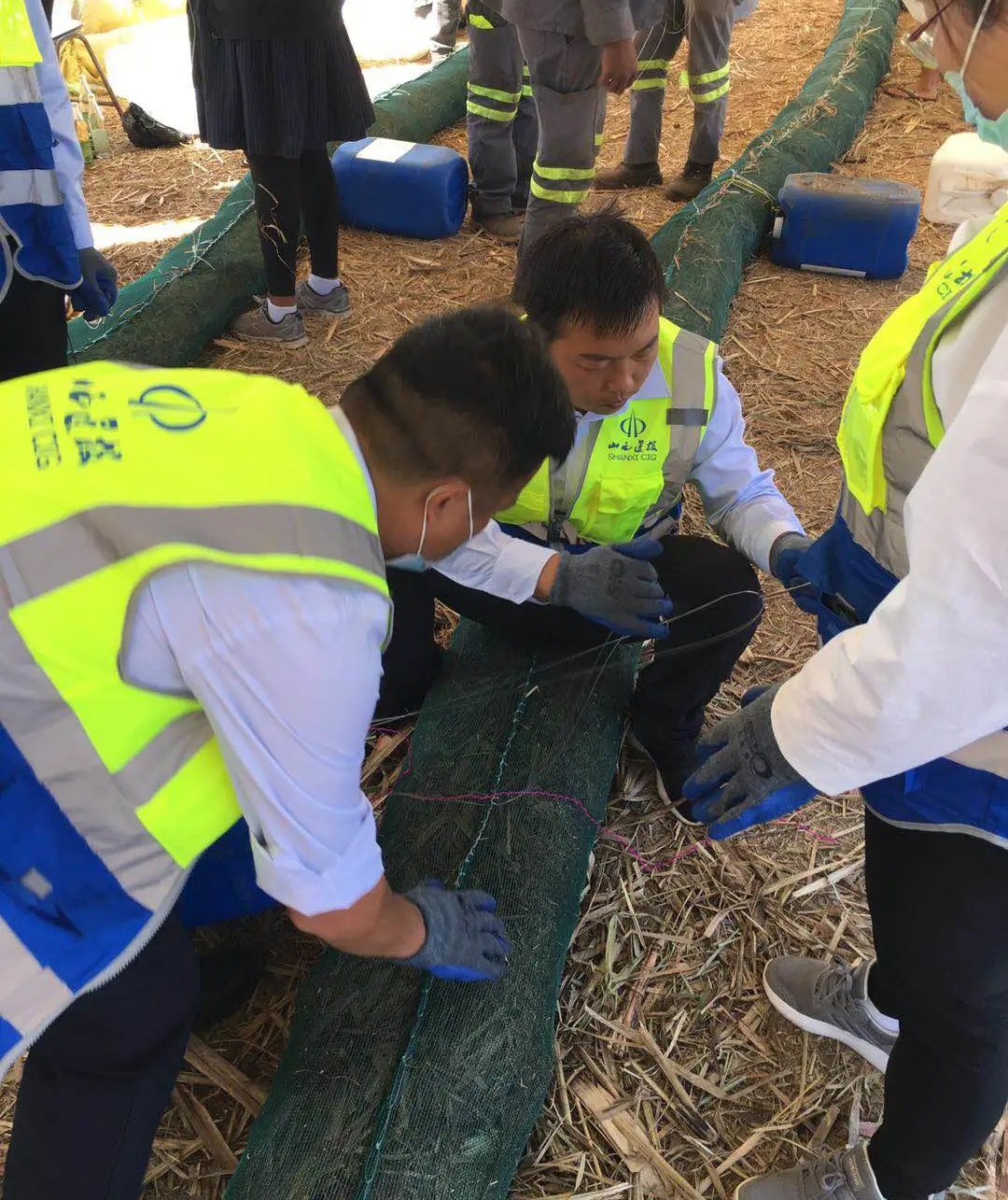 外地清早,公司项目部职员第一时间将200双胶鞋,200双胶皮手套,300瓶矿泉水等救援物资装运,驱车前往40公里之外的蓝湾,在毛里求斯渔业部相关职员的指挥下,将物资卸至指定所在。在Mahebourg广场,公司项目职员和外地民众一起制作隔油栏,将土工布里放上甘蔗叶和塑料瓶,缝好后安排在海里阻止石油伸张。
