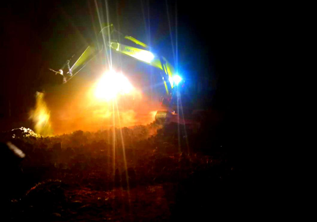 在施工步队连夜作业时,急降骤雨,各人冒雨与时间赛跑。由于火情点地形重大,山林荆棘密布,施工条件十分苛刻,机械装备操作职员、现场治理职员累了就在挖掘机旁眯一会,饿了就吃包泡面抗一抗。