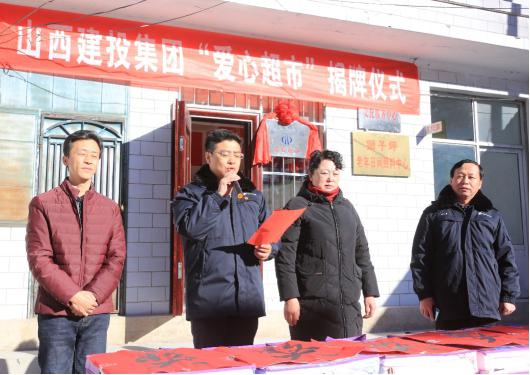 山西建投四建集团工会主席崔建军、狮子坪村主任张秀平,配合为“爱心超市”揭牌,张秀平代表村民表达了对山西建投四建集团帮扶事情的由衷谢谢。