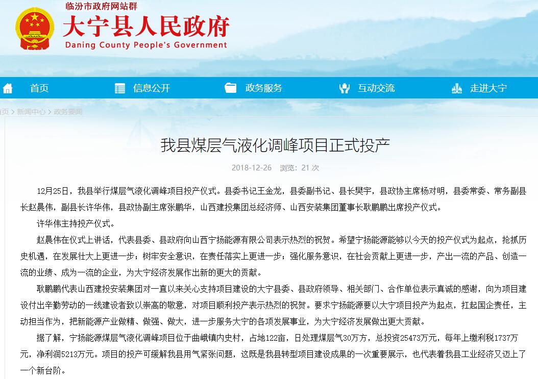 ´óÄþÏØÃº²ãÆøÒº»¯µ÷·åÏîÄ¿ÊÇ´óÄþÏØ¡°Ê®ÈýÎ塱ʱ´úÐÂÄÜÔ´ÖØµãÏîÄ¿£¬Õ¼µØ122Ķ£¬ÈÕ´¦Öóͷ£Ãº²ãÆø30Íò·½£¬×ÜͶ×Ê25473ÍòÔª£¬Ã¿ÄêÉϽÉÀû˰1737ÍòÔª¡£ÏîÄ¿µÄͶ²ú¿É»º½â´óÄþÏØÓÃÆøÖ÷ÒªÎÊÌâ¡£