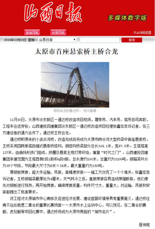 《山西日报》2018年12月3日16版对山西建投四建集团太原市汾东新区—通达桥刷新项目的报道: