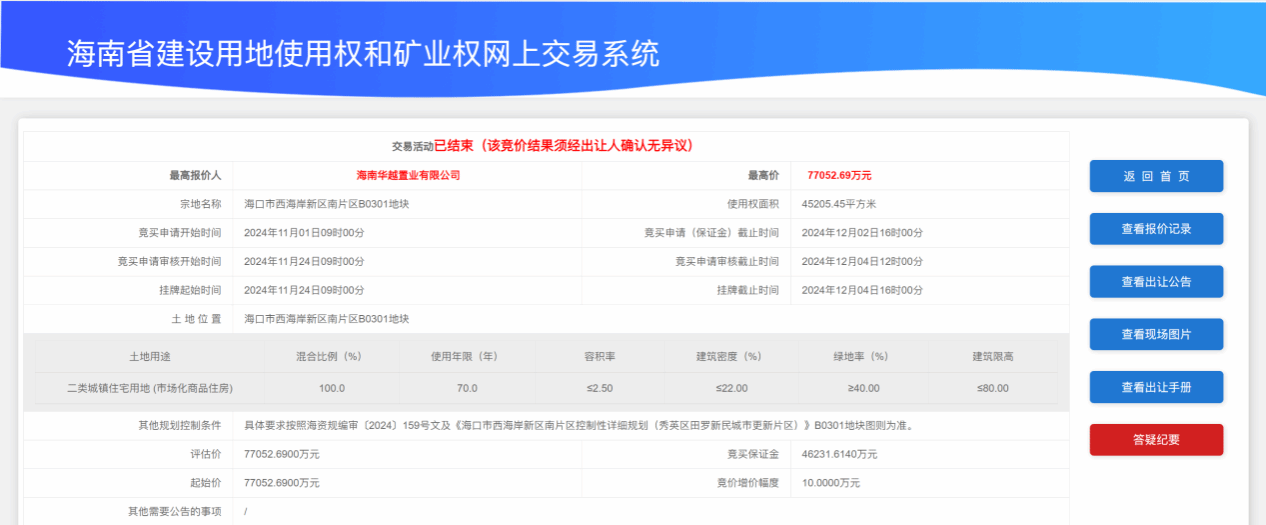 12ÔÂ4ÈÕ£¬É½Î÷½¨Í¶ËĽ¨¼¯ÍÅÓë¶¼»áÔËÓª¼¯ÍÅ¡¢Èý½¨¼¯ÍźÏ×ʽ¨ÉèµÄº£ÄÏ»ªÔ½ÖÃÒµÓÐÏÞ¹«Ë¾£¬ÀֳɾºµÃº£¿ÚÊÐÎ÷º£°¶ÐÂÇøÄÏÆ¬ÇøB0301µØ¿é¡£¸ÃµØ¿éÊǼÌ2024Äê4ÔÂ18ÈÕÕªµÃº£¿ÚÊÐÎ÷º£°¶ÐÂÇøÄÏÆ¬ÇøA6201µØ¿éºóµÄÓÖһеؿé¡£