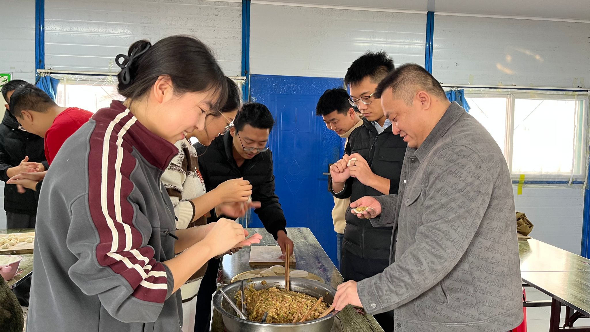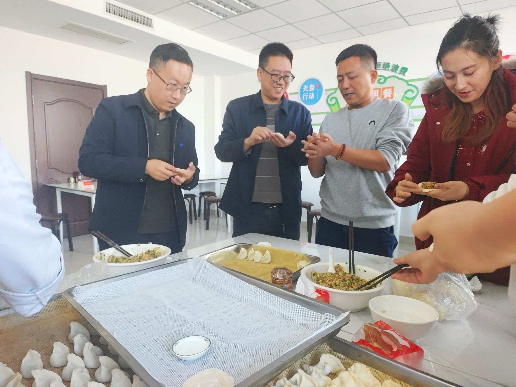食堂厨师师傅们一大早就去菜市场采购新鲜肉类、蔬菜、佐料。各单位职工们齐聚食堂,放料调馅、和面、擀皮……一场关于饺子的盛宴徐徐睁开。