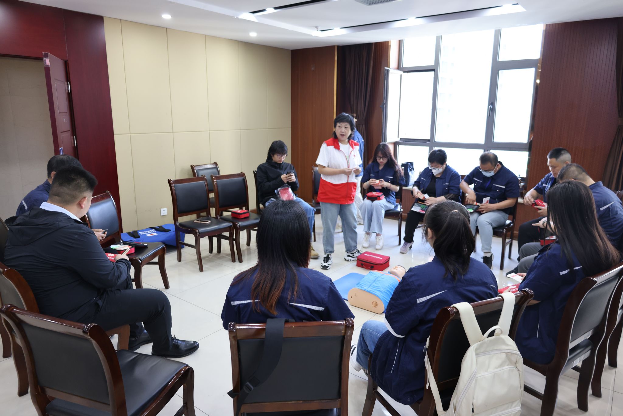 培训接纳理论解说与现场演示、互动教学相团结的方法,对红十字运动基本知识、救护概论、心肺苏醒(CPR)、自动体外除颤仪的使用(AED使用)、创伤救护基本手艺、气道异物梗阻处置惩罚等方面作相识说。模拟训练让参训职员真切地体会到在紧迫情形下,坚持冷静、迅速反应的主要性,越发直观地感受和掌握抢救步伐的操作技巧和规范流程。