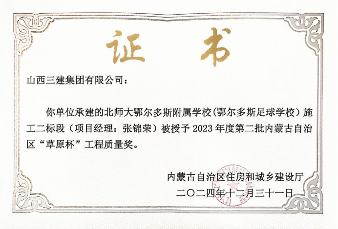 克日,从内蒙古自治区住房和城乡GGPoker厅传来喜讯,山西建投三建集团承建的北师大鄂尔多斯隶属学校(鄂尔多斯足球学校)施工二标段,荣获内蒙古自治区“草原杯”工程质量奖 。