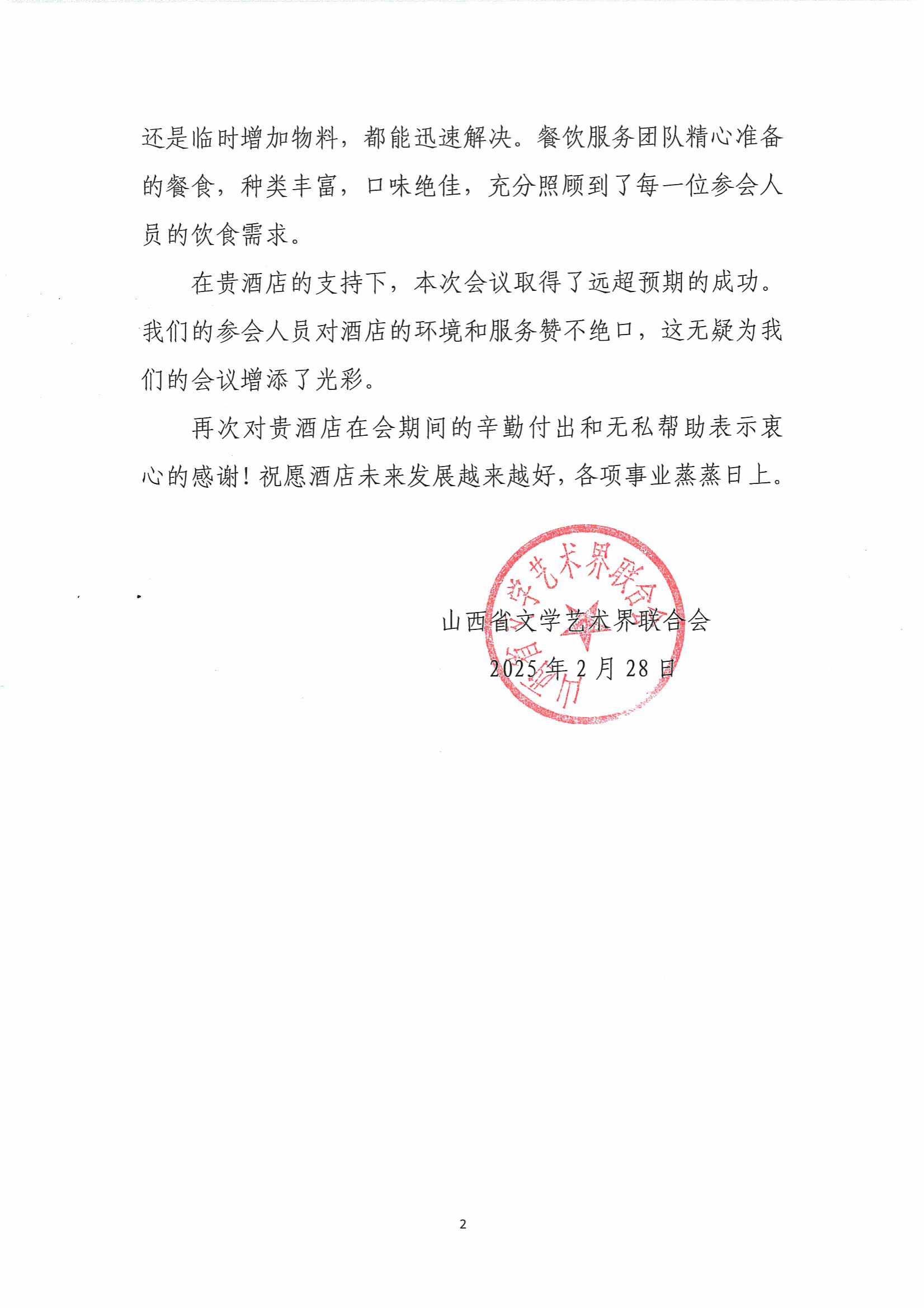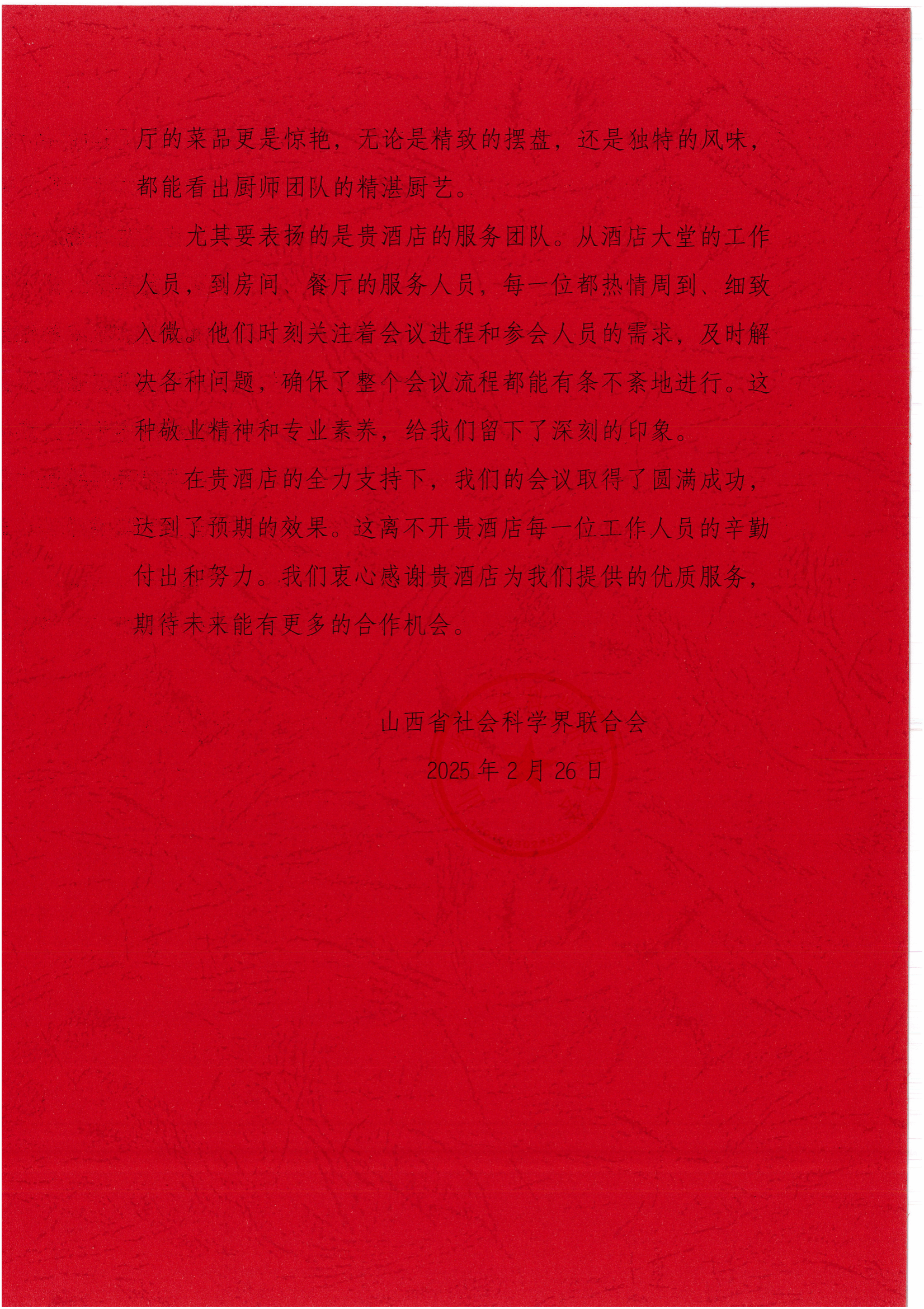 2ÔÂ23ÈÕÖÁ25ÈÕ£¬É½Î÷Ê¡ÎÄѧÒÕÊõ½çÍŽá»áµÚÊ®´Î´ú±í´ó»á¡¢É½Î÷Ê¡×÷¼ÒлáµÚ°Ë´Î´ú±í´ó»á¡¢É½Î÷Ê¡Éç»á¿ÆÑ§½çÍŽá»áµÚËĴδú±í´ó»áÕÙ¿ª¡£É½Î÷äìºÓгÇÂùÝȺ×÷Ϊ¾Û»á²ÍË޳нÓÂùݣ¬ÒԸ߶ȵÄÔðÈθС¢¸ß±ê×¼µÄ·þÎñÆ·ÖÊ»ñµÃÓë»á´ú±íÒ»ÖÂºÃÆÀ£¬Ï²»ñɽÎ÷Ê¡Éç»á¿ÆÑ§½çÍŽá»á¡¢É½Î÷Ê¡ÎÄѧÒÕÊõ½çÍŽá»á·¢À´µÄллÐÅ¡£