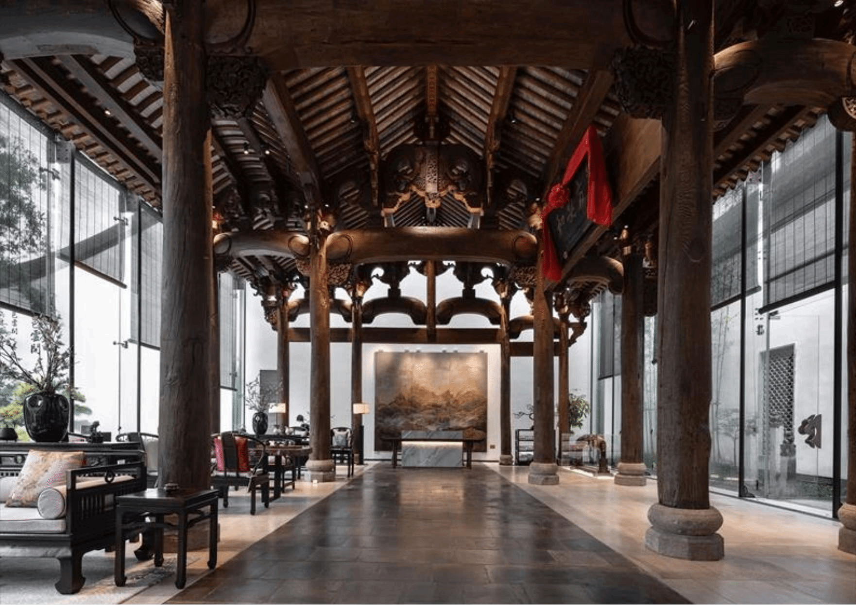 园区可生产仿古修建柱梁、胶合木柱、胶合木梁、大跨度胶合弯梁、轻型木结构墙体、轻型木桁架、木结构毗连件等7种木结构构件产品,以及木雕、砖雕、石雕等配套装饰类构件产品,具有重量轻、施工快、抗震性能好、恬静、雅观等优点。
