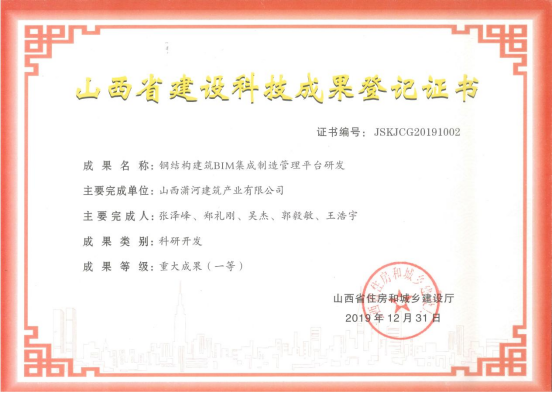 钢结构修建BIM集成制造治理平台研发效果挂号证书